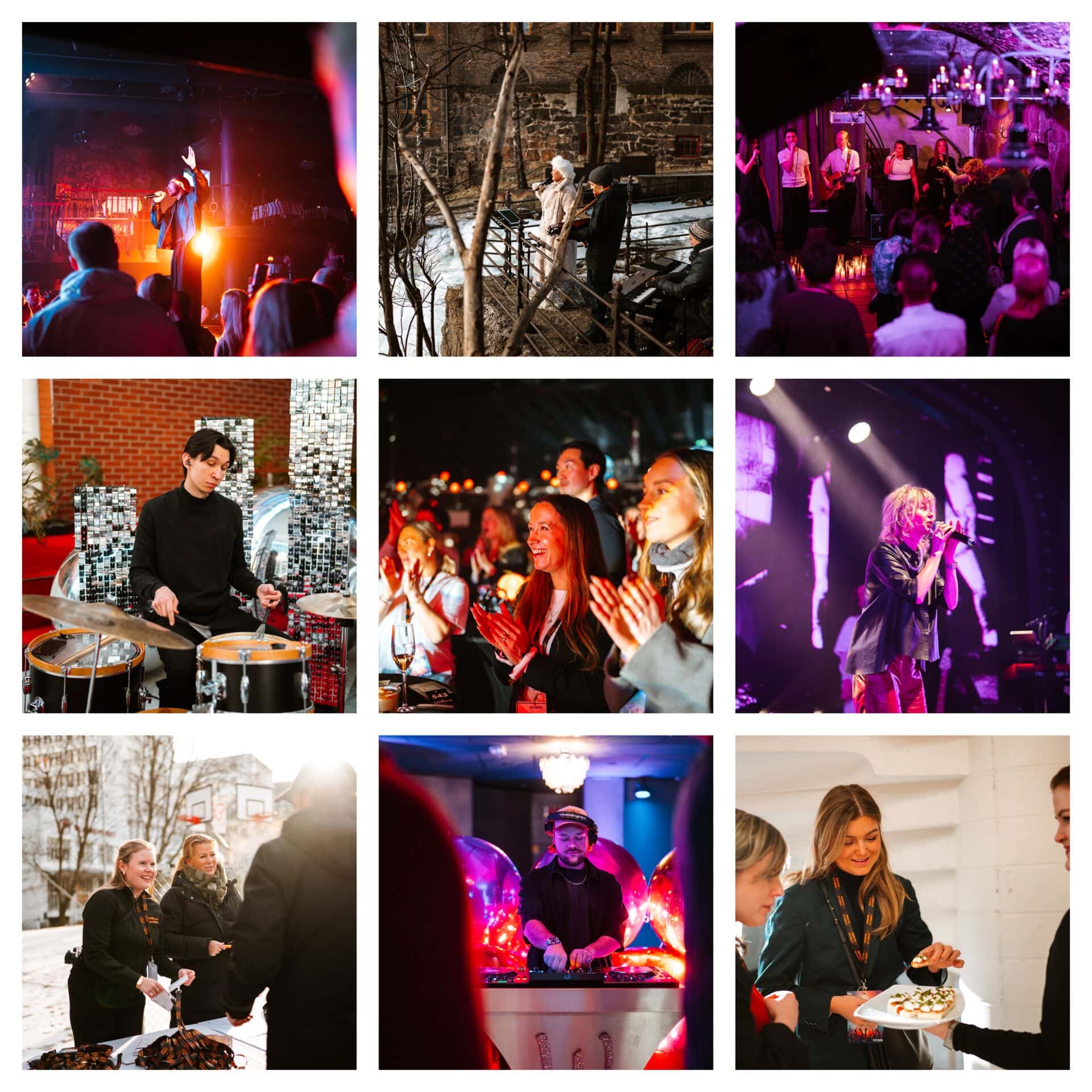 Gjennom en guidet rundtur tok vi gjestene med på en reise gjennom de ulike rommene, og viste hvordan de kan brukes og kombineres. I Vinterhagen ble det servert kanapeer akkompagnert av vakre jazztoner fra vår egen trio Pontus, Jenny og Zacharias – blant årets artister på Wallmans. I Turbinen ble cocktails servert til nydelig akustisk musikk i mer intime omgivelser.